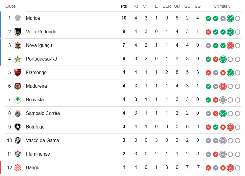 Veja a classificação da Taça Guanabara após os jogos de 4ª-feira da 4ª rodada