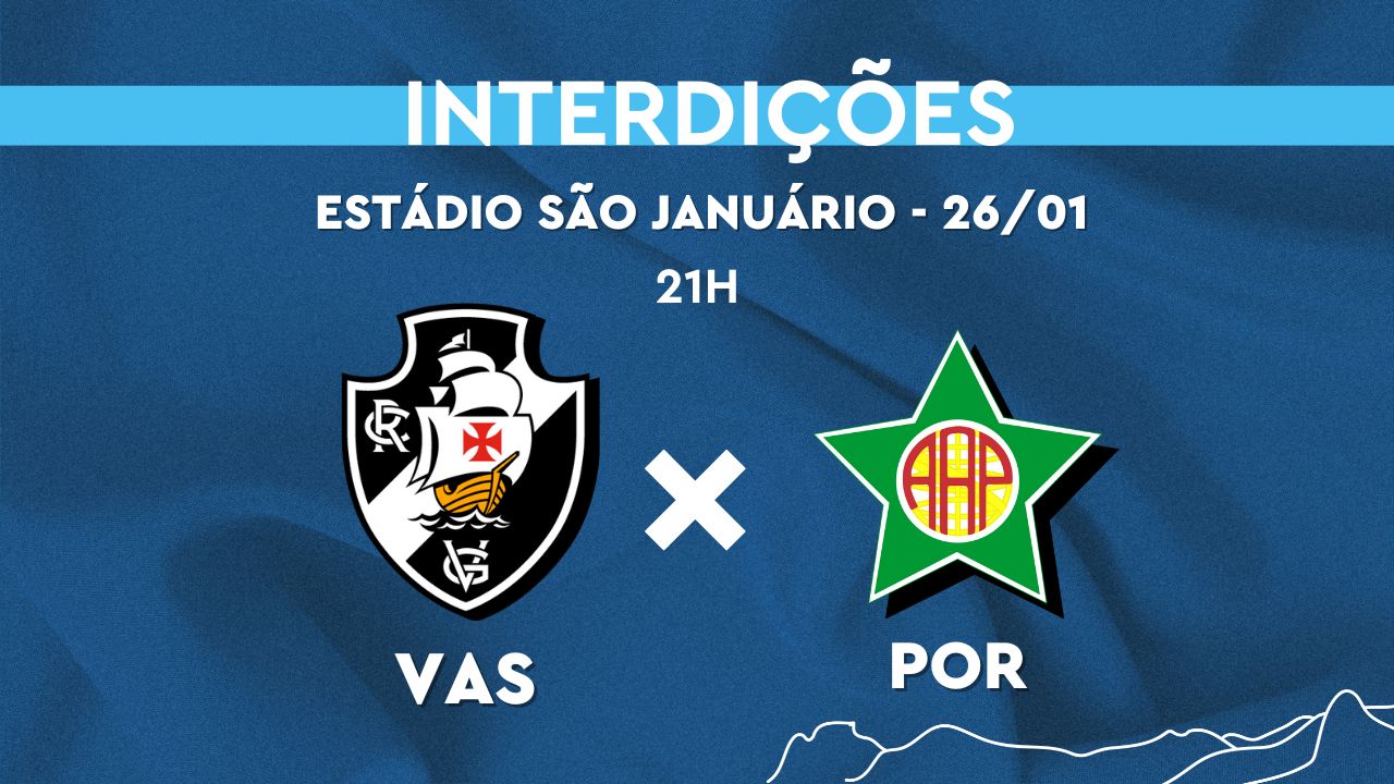 O Centro de Operações e Resiliência (COR), por meio da CET-Rio, informa que neste domingo (25/01), realiza interdições no entorno do estádio São Januário, no bairro Vasco da Gama, em função do jogo entre Vasco e Portuguesa, às 21h. A partir de 14h, começam os bloqueios na região.