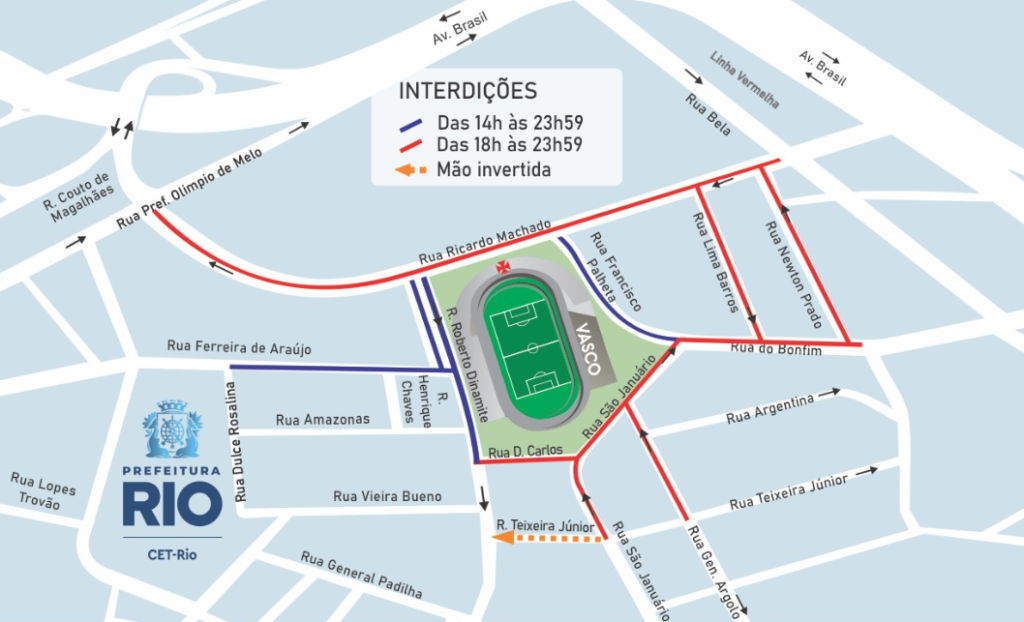 – Rua do Bonfim, no sentido ao Estádio de São Januário, entre a rua Newton Prado e a rua São Januário;