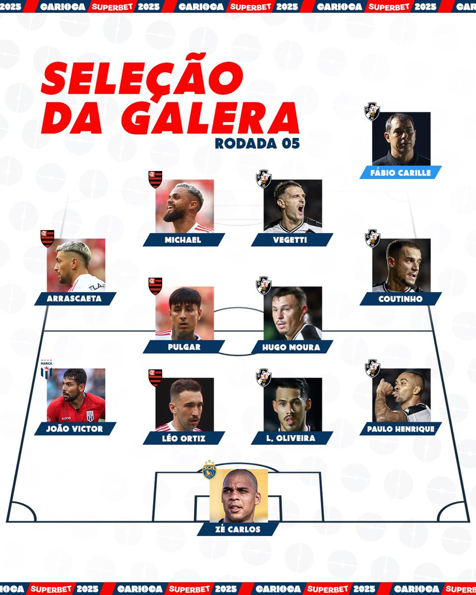 Paulo Henrique, Lucas Oliveira, Hugo Moura, Coutinho, Vegetti e Carille estão na #SeleçãoDaGalera da 5ª rodada do Carioca