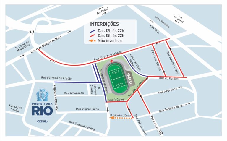 O Centro de Operações e Resiliência (COR), por meio da CET-Rio, informa que nesta quarta-feira (29/1), realiza interdições no entorno do estádio São Januário, no bairro Vasco da Gama, em função do jogo entre Vasco e Maricá, às 19h. A partir de 12h começam os bloqueios na região.