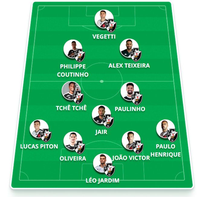 Provável escalação do Vasco: Léo Jardim, Paulo Henrique, João Victor, Lucas Oliveira, Lucas Piton, Jair, Tchê Tchê, Paulinho, Coutinho, Alex Teixeira e Vegetti.