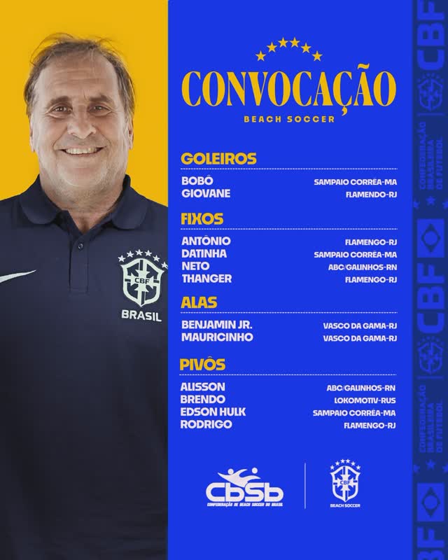 Na tarde desta sexta-feira (17), o técnico Marco Otavio convocou a Seleção Masculina de Beach Soccer para a CONMEBOL Copa América Beach Soccer 2025™️, primeiro grande torneio de 2025. A competição será realizada no Chile, a partir de 22 de fevereiro, traçando toda a emoção do campeonato continental.