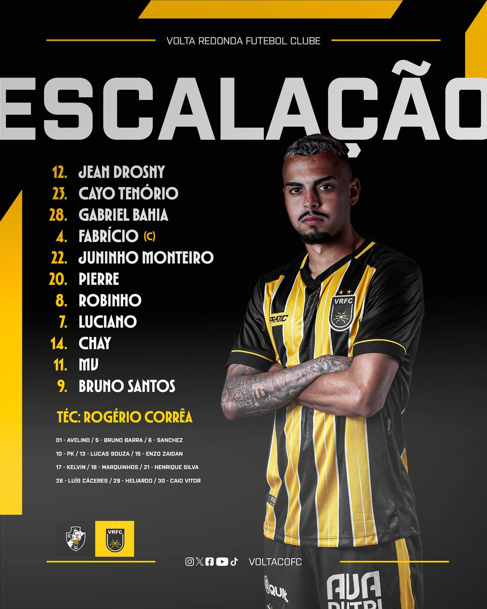 Veja a escalação do Volta Redonda para o jogo contra o Vasco; ex-vascaínos Cayo Tenório, Fabrício e Luciano são titulares
