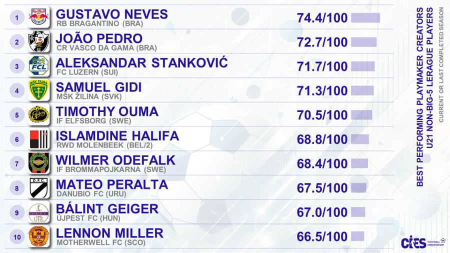 De acordo com o Observatório do Futebol (@CIES_Football), JP foi o segundo melhor meio-campista criativo sub-21 do mundo, fora das 5 principais ligas europeias.