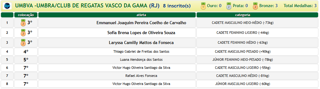 Bronze: Sofia Brena Lopes de Oliveira Souza (-44kg/Umbra-Vasco); Laryssa Camilly Mattos da Fonseca (-63kg/Umbra-Vasco); Emmanuel Joaquim Pereira Coelho de Carvalho (-73kg/Umbra-Vasco); Clarisse Rocha Vallim (-70kg/Flamengo); Gelson Riederer Mazzotti Santos Ricken III (-90kg/Reação)