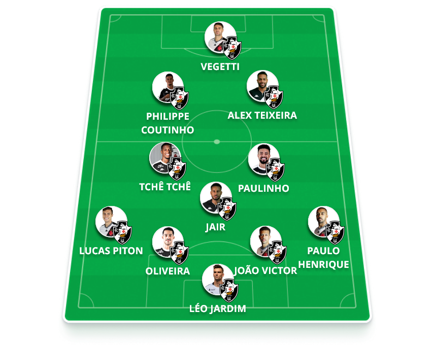 Provável escalação do Vasco: Léo Jardim, Paulo Henrique, João Victor, Lucas Oliveira, Lucas Piton, Jair, Tchê Tchê, Paulinho, Payet, Alex Teixeira (Zuccarello) e Vegetti.
