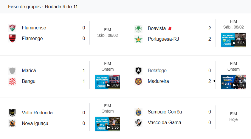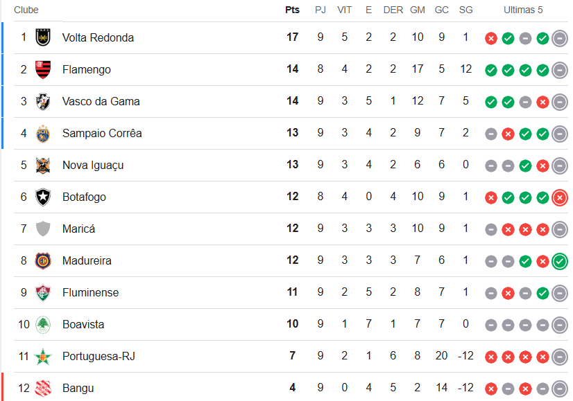 Terminada a 9ª rodada da Taça Guanabara, o Vasco, que empatou com o Sampaio Corrêa por 0 a 0, está na 3ª colocação. Botafogo e Flamengo têm um jogo a menos em relação aos demais competidores. Os 4 primeiros colocados avançam para as semifinais do Carioca e os clubes do 5º ao 8º colocado se classificam para as semifinais da Taça Rio.