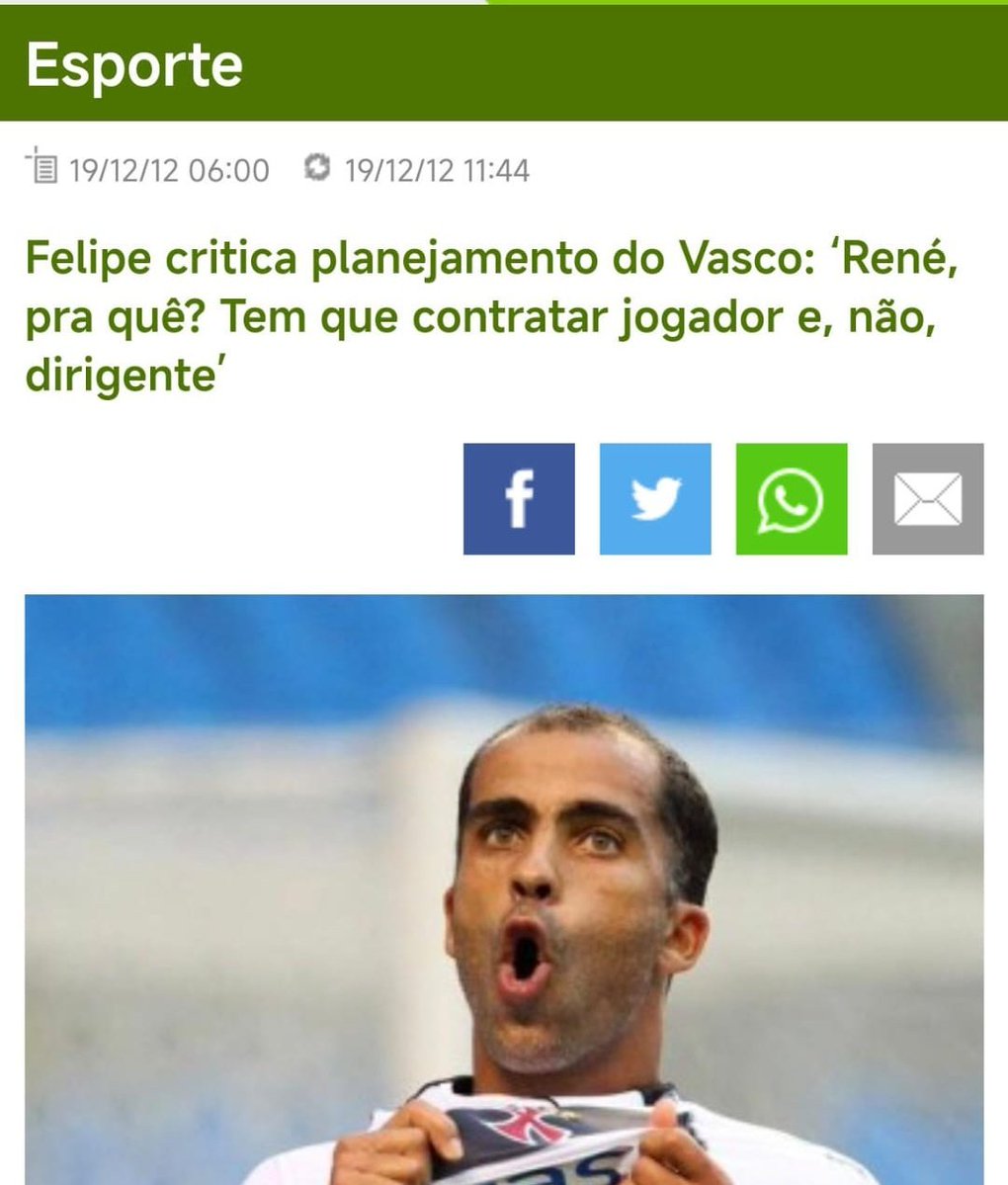 Vascaíno 'resgata' crítica do então jogador vascaíno Felipe em 2012: 'Tem que contratar jogador, e não dirigente'