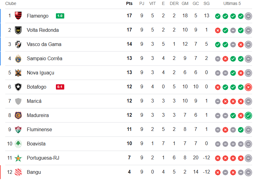 Veja a classificação da Taça Guanabara após o jogo atrasado Urubu 1 x 0 Botafogo