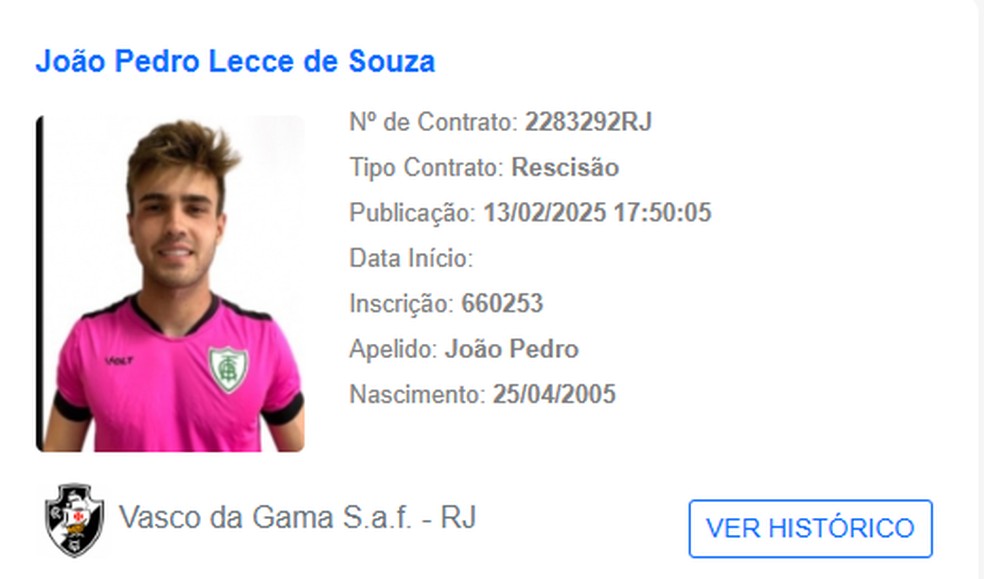 O goleiro João Pedro Lecce rescindiu seu contrato com o Vasco e acertou em definitivo com o América-MG. O jovem de 19 anos estava emprestado ao clube mineiro desde setembro do ano passado e vai assinar um novo vínculo até o fim de 2026.