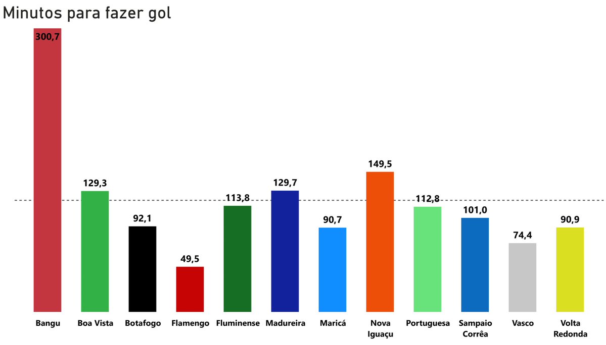 O Vasco, mais uma vez, é o segundo melhor colocado no quesito, com 74,4 minutos para marcar um gol na competição.