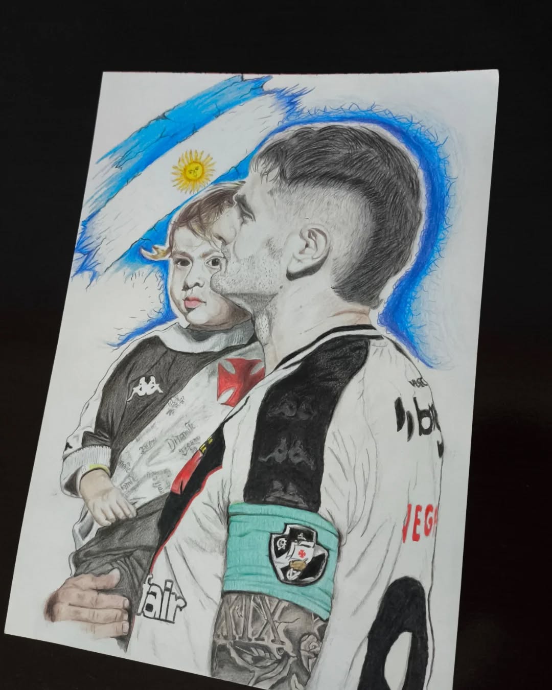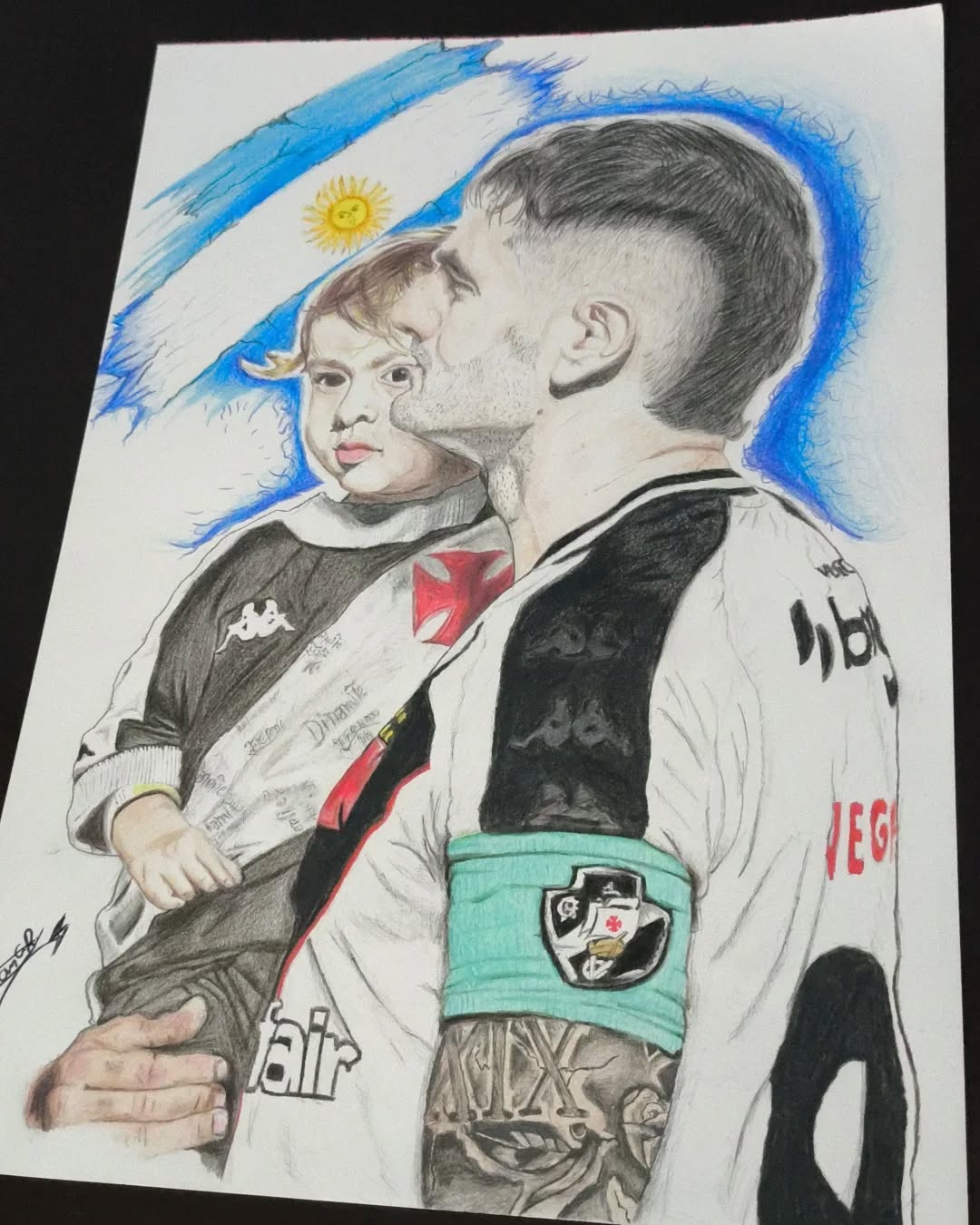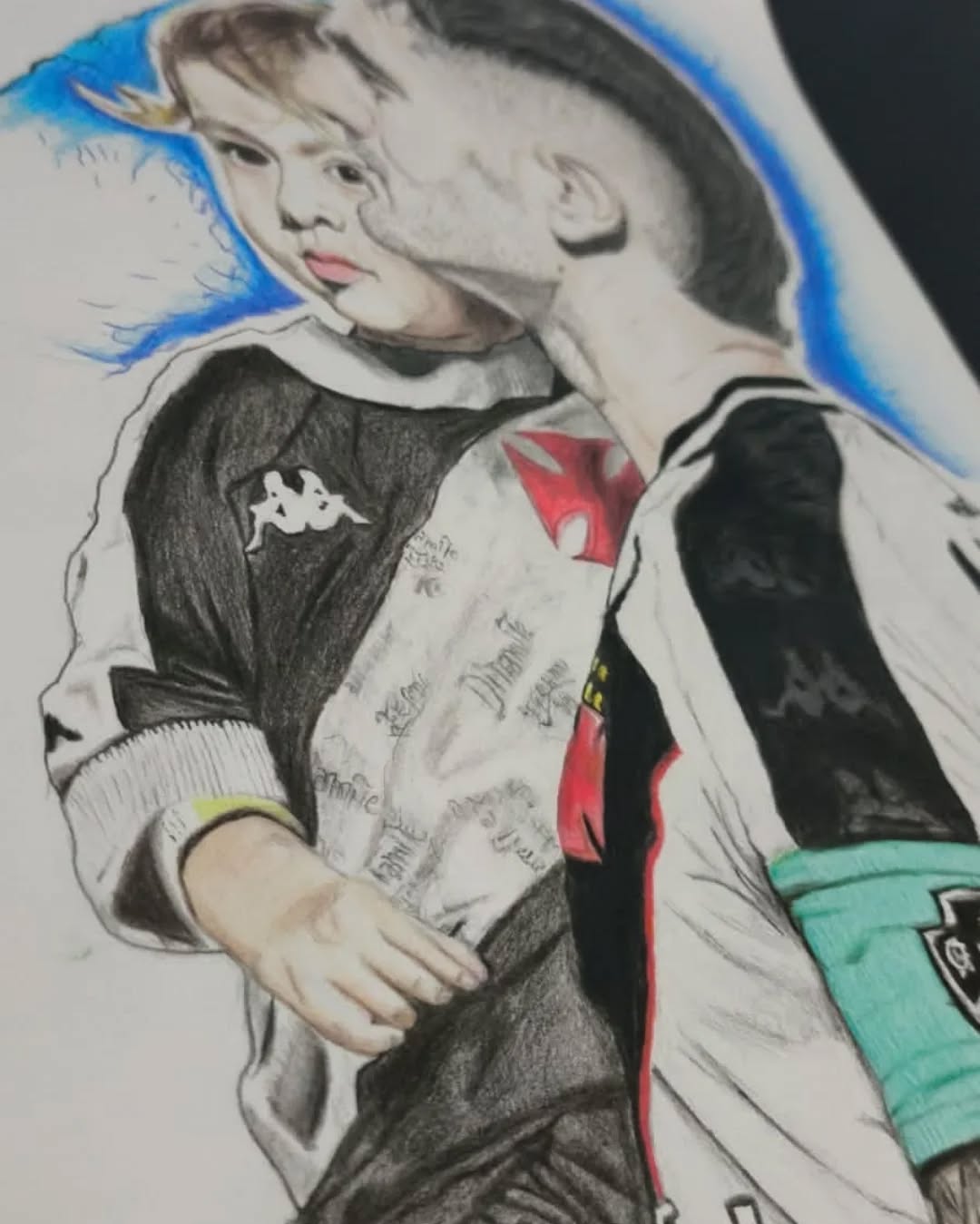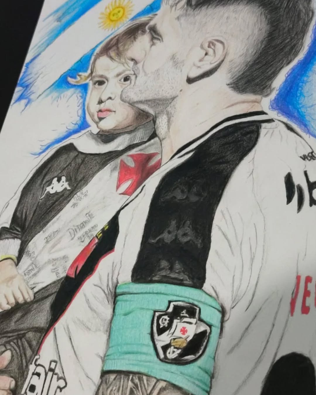 Artista vascaíno Yan faz desenho de Vegetti com seu filho Vittorio