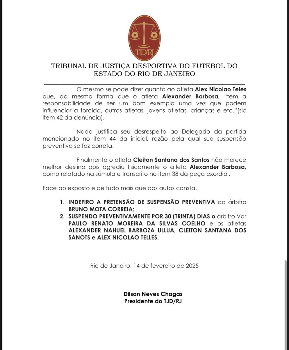 Atenção! O Presidente do TJD suspendeu preventivamente, por 30 dias, os atletas Cleiton, do Flamengo, e Alex Telles e Barboza, ambos do Botafogo.
