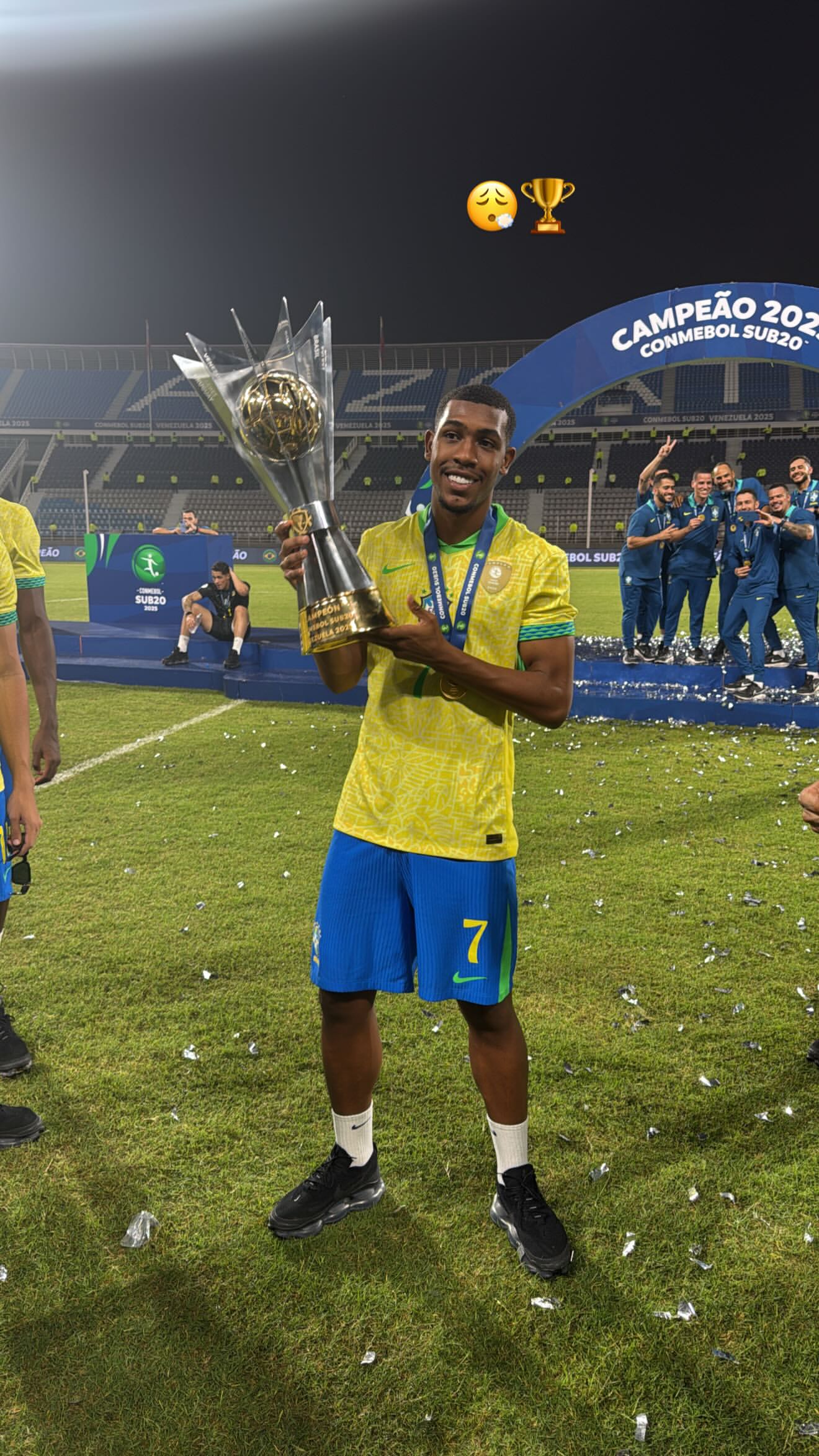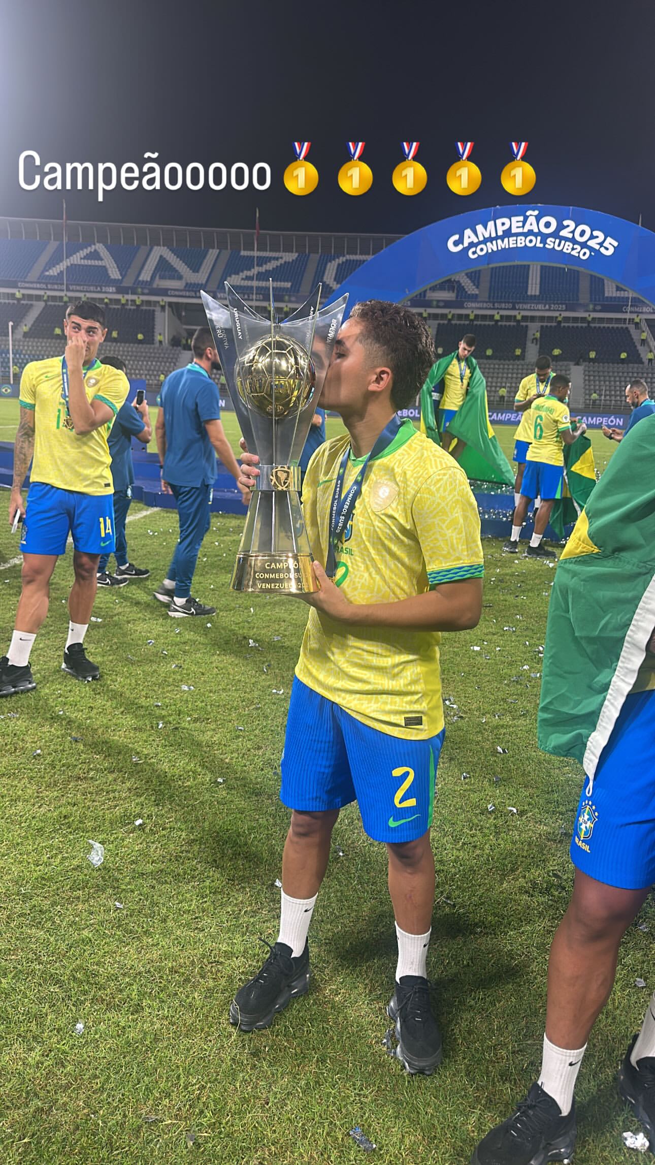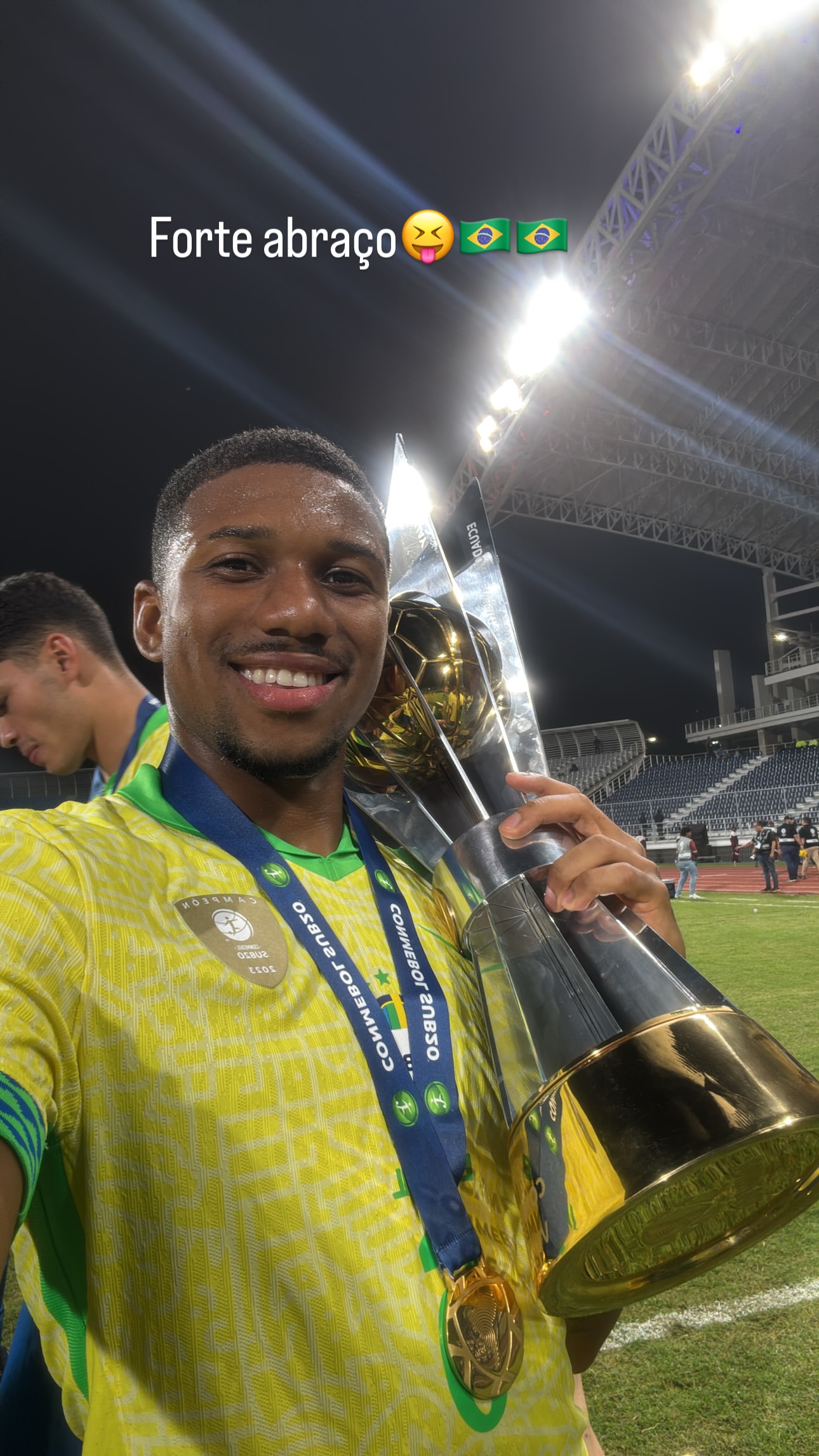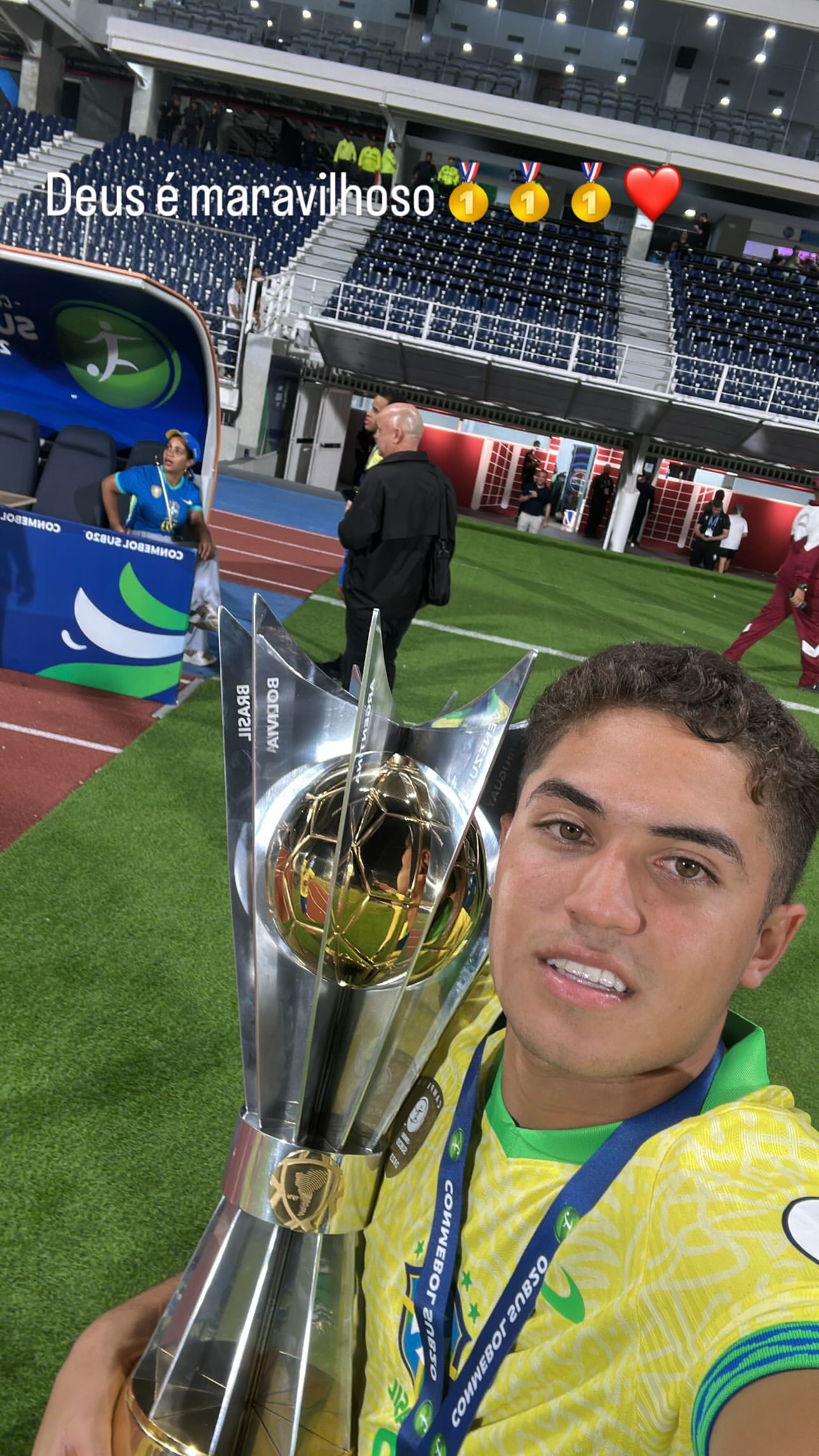 Leandrinho, Paulo Ricardo e Rayan posam com a taça de campeão do Sul-Americano Sub-20