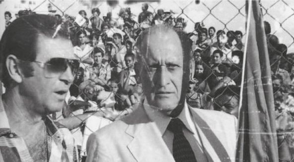 O técnico era Yustrich, que na foto aparece fazendo a sua preleção no gramado do Mammoud Abbas.