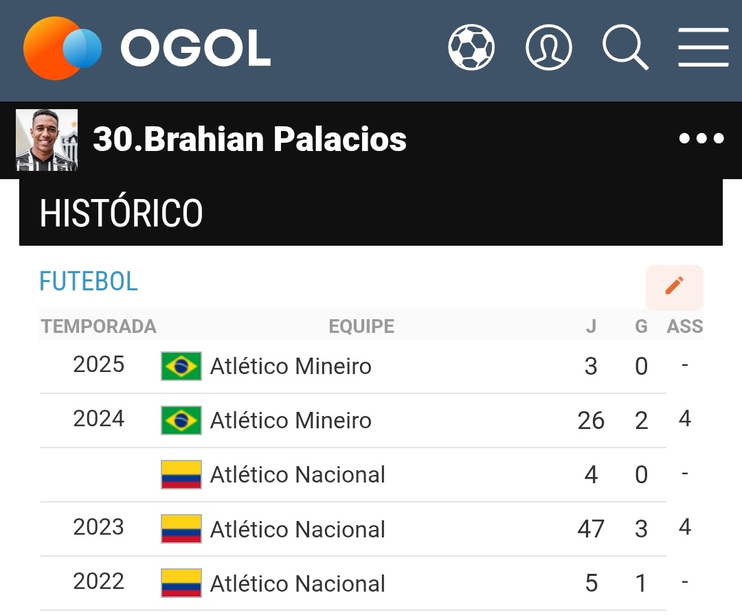 🚨 Números do atacante Brahian Palácios, que é especulado no VASCO.