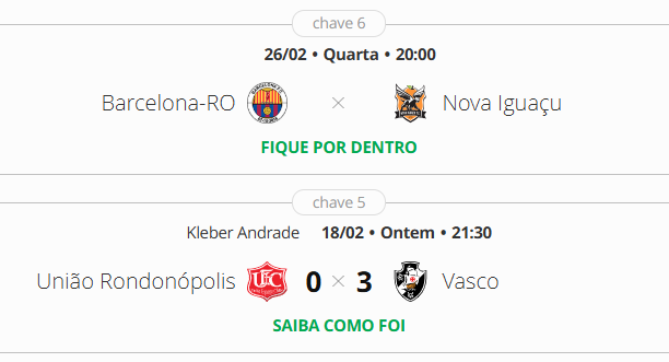 O adversário do Vasco na 2ª fase da Copa do Brasil será Barcelona-RO ou Nova Iguaçu, que se enfrentam no dia 26/02 na casa do time rondoniense. O duelo pela 2ª fase será na primeira ou na segunda semana de março, em jogo único, na casa do adversário, sem vantagem do empate para nenhuma das equipes.