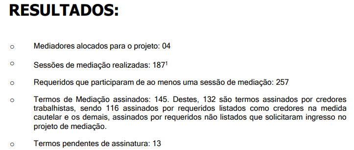 145 termos assinados, sendo 132 por credores trabalhistas.