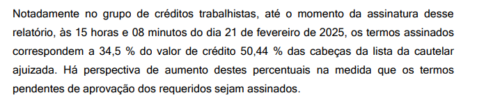 No grupo trabalhista isso corresponde a 50,44% dos credores listados e 34,5% do crédito.