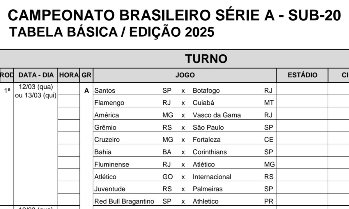O Vasco já sabe a sequência de adversários que encarará no Brasileiro Sub-20. A CBF divulgou a tabela provisória da competição, ainda sem dias, horários e locais. O time do técnico Matheus Curopos vai estrear contra o América-MG. Confira os duelos da 1a rodada: