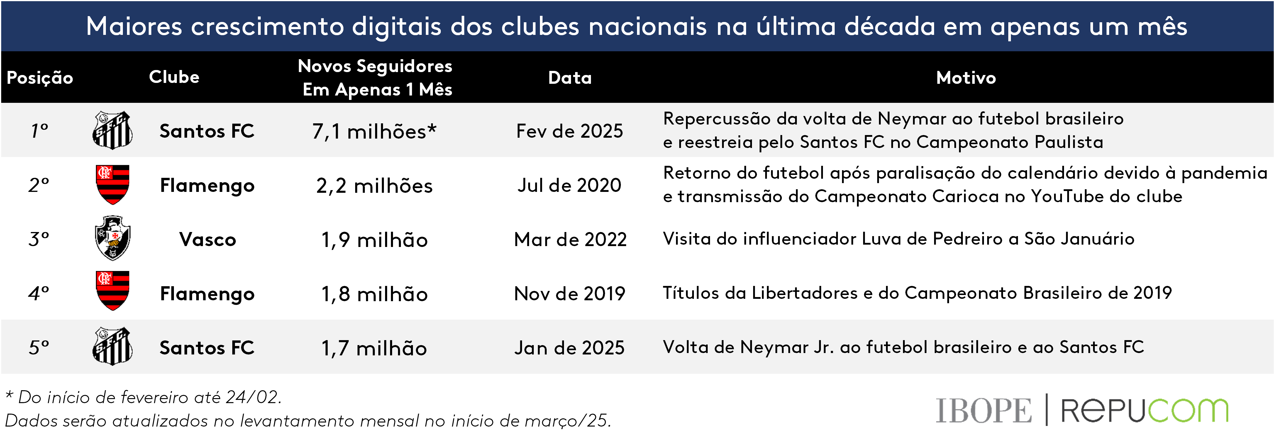 Para dimensionar o feito do clube, o número de novos seguidores acumulados em fevereiro até o momento supera o ganho total de todos os clubes de futebol no Brasil ao longo de 2024 e é mais de oito vezes superior ao resultado anual do Santos na temporada anterior.