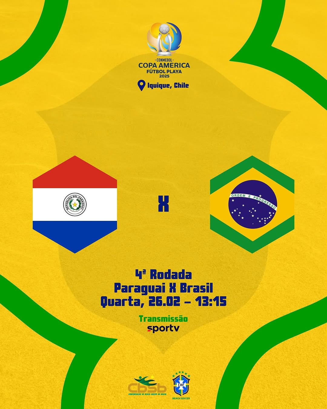 Depois de folgar na 3ª rodada na segunda-feira (24) e do descanso geral da @copaamerica na terça, o Brasil volta a campo nesta quarta-feira (26), às 13h15, pela 4ª rodada, para encarar seu grande rival sul-americano nas areias, o Paraguai! Acompanhe todas as emoções desse jogaço ao vivo e com exclusividade no @sportv 👀