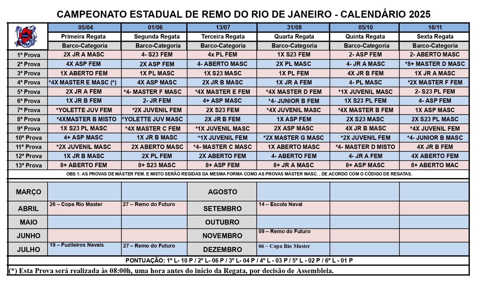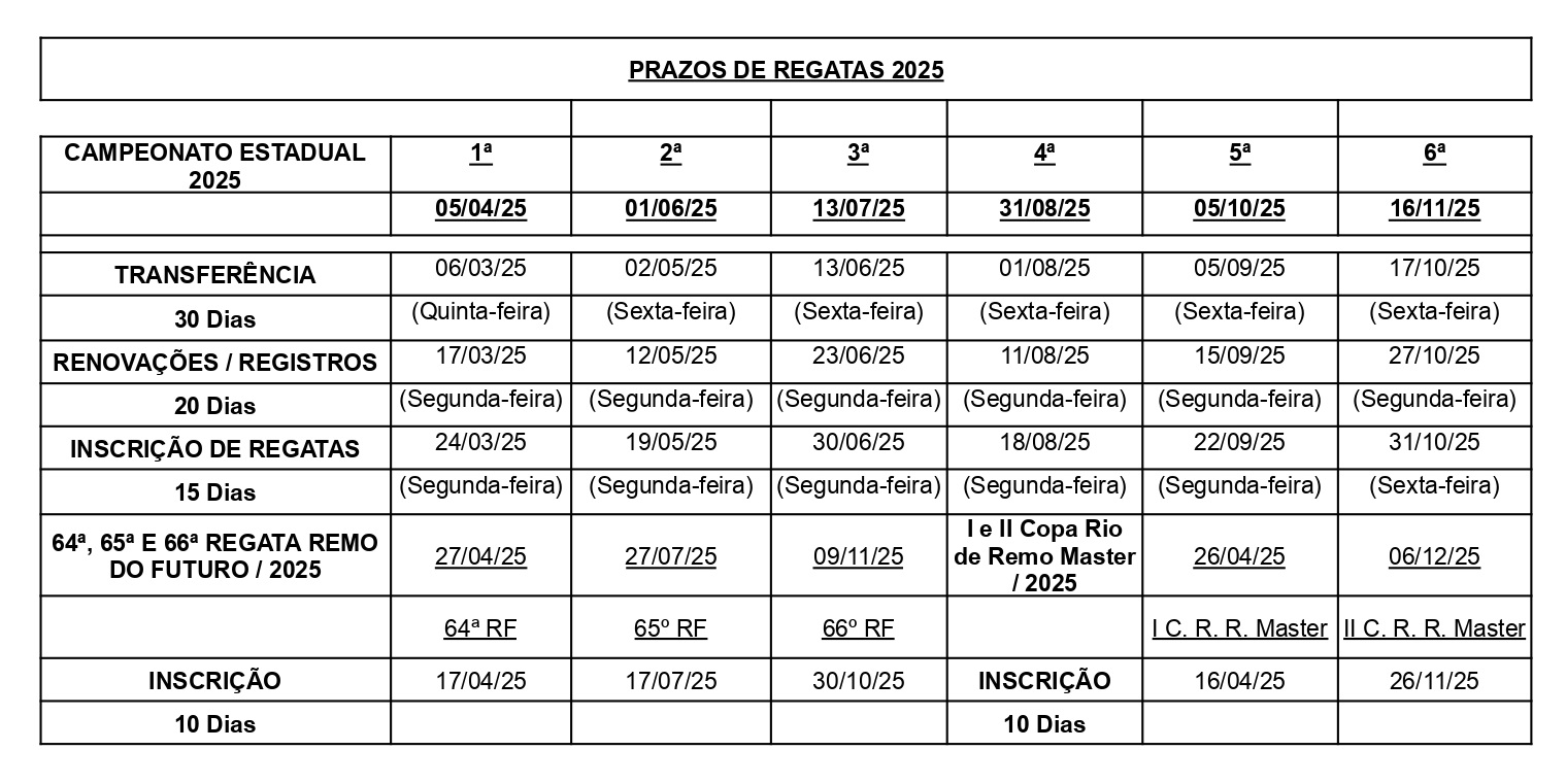 A Federação de Remo do Estado do Rio de Janeiro (FRERJ) tem o prazer de anunciar a publicação oficial do Calendário de Regatas 2025! Todas as competições que fazem parte do circuito estadual já têm datas definidas, garantindo uma temporada repleta de emoção e disputas de alto nível nas águas cariocas.