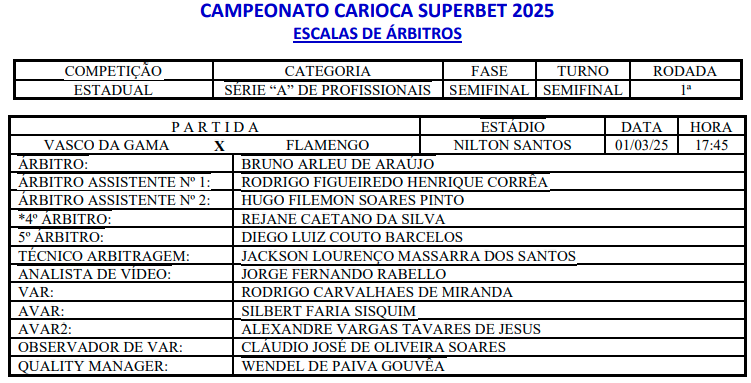 Bruno Arleu de Araújo apitará Vasco x Urubu; Rodrigo Carvalhaes de Miranda será o VAR