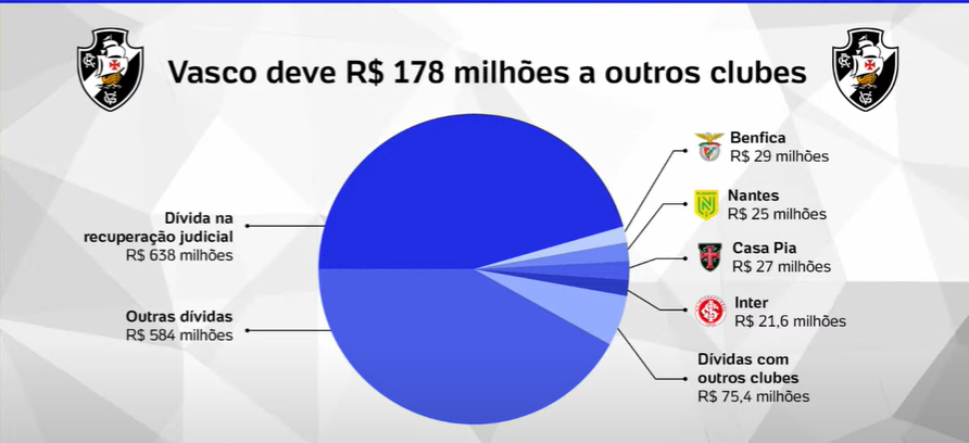 Benfica, Nantes, Casa Pia e Internacional são os clubes aos quais o Vasco mais deve