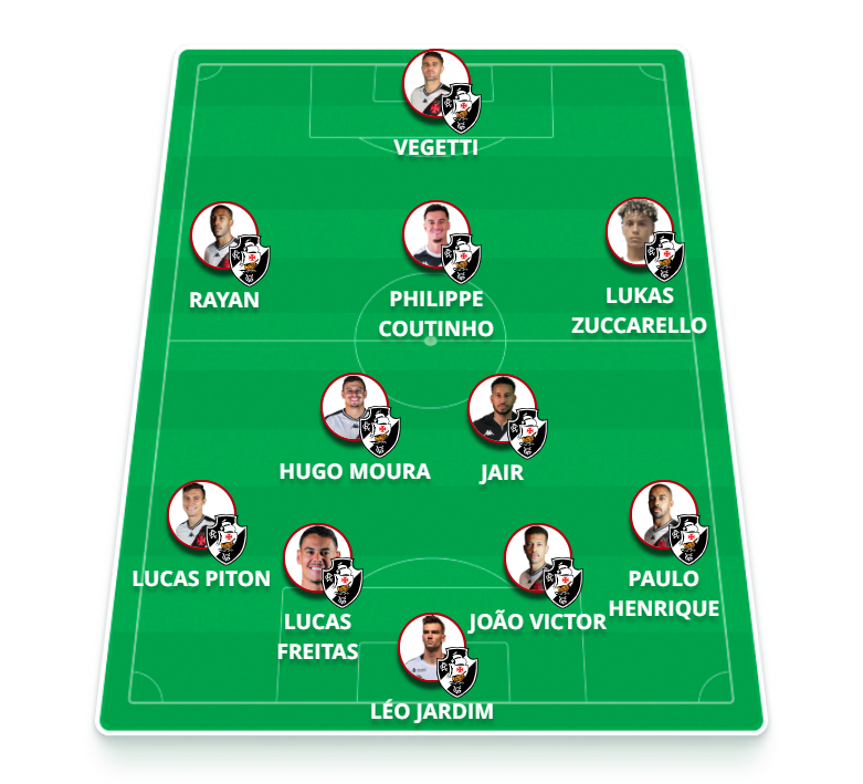Provável time: Léo Jardim, Paulo Henrique, João Victor, Lucas Freitas, Lucas Piton, Hugo Moura, Jair (Tchê Tchê ou Cocão), Coutinho, Zuccarello (Loide), Rayan e Vegetti.