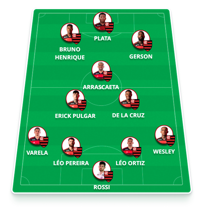 Provável time: Rossi, Wesley, Léo Pereira, Léo Ortiz e Varela; Pulgar, De la Cruz (Evertton Araújo) e Arrascaeta (Luiz Araújo); Gerson, Plata e Bruno Henrique.