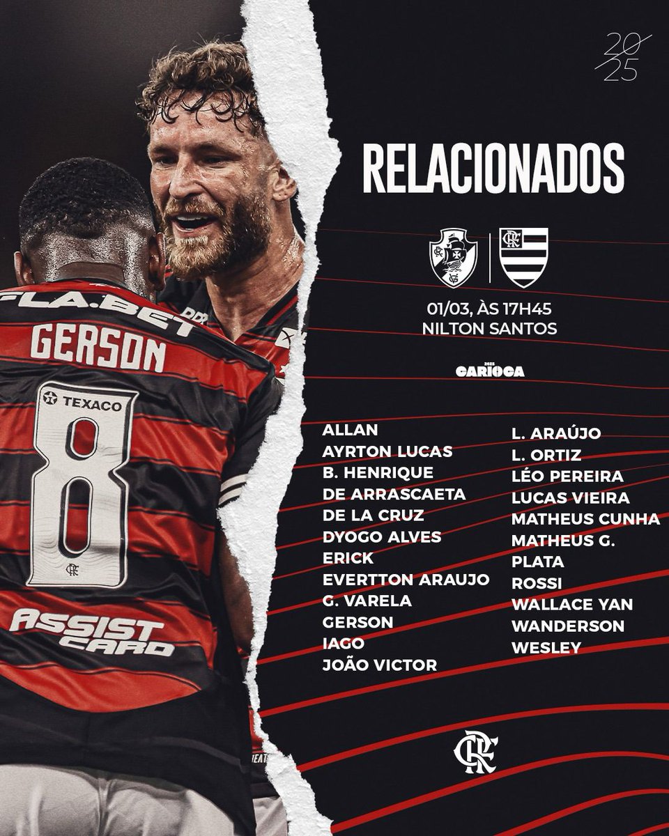 Os relacionados do Flamengo para pegar o Vasco hoje. Como falamos ontem, Juninho e Alex Sandro estão fora do duelo por ser grama sintética. Se fosse grama natural, os dois seriam convocados por Filipe Luís.