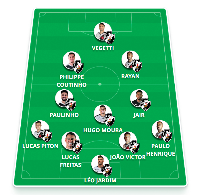 Provável escalação: Léo Jardim, Paulo Henrique, João Victor, Lucas Freitas, Lucas Piton, Hugo Moura, Paulinho (Cocão), Jair (Loide), Coutinho, Rayan e Vegetti.