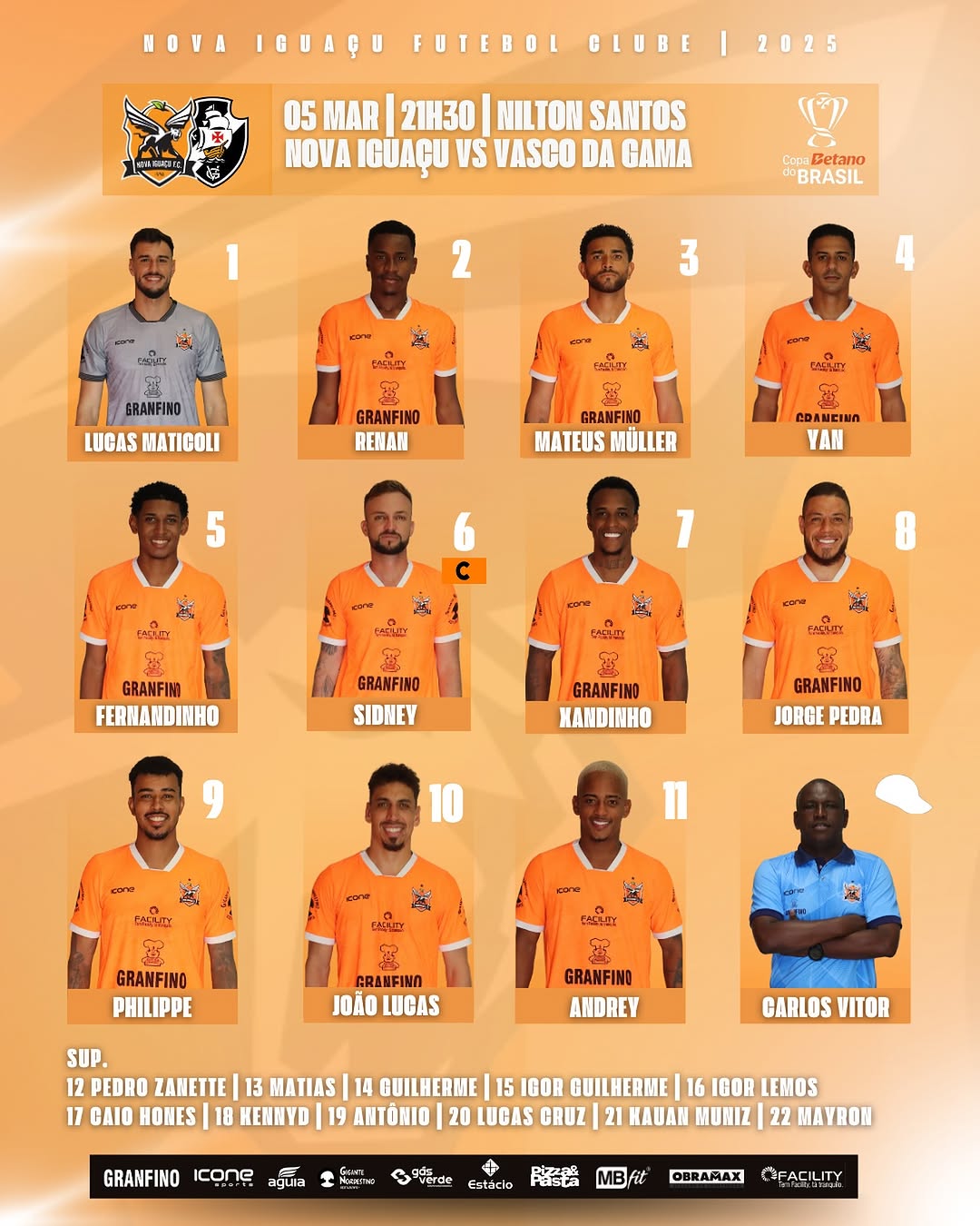 Nova Iguaçu escalado pelo técnico Carlos Vitor. 🍊