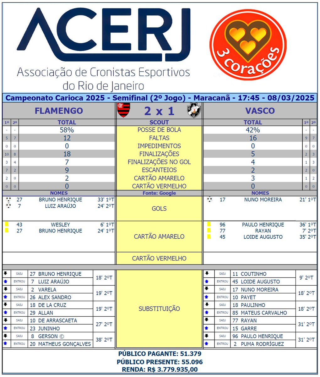 No jogo de volta da semifinal do Campeonato Carioca, o Vasco foi derrotado pelo Flamengo por 2 a 1 na noite deste sábado, no Maracanã, e se despediu da competição. No 1º tempo, Nuno Moreira abriu o marcador para o Vasco aos 21 minutos e Bruno Henrique empatou para o Flamengo aos 33 minutos, em gol confirmado pelo VAR mesmo com o jogador rubro-negro um pouco à frente da linha (veja fotos abaixo). Na etapa final, Luiz Araújo fez o segundo do Flamengo aos 23 minutos.