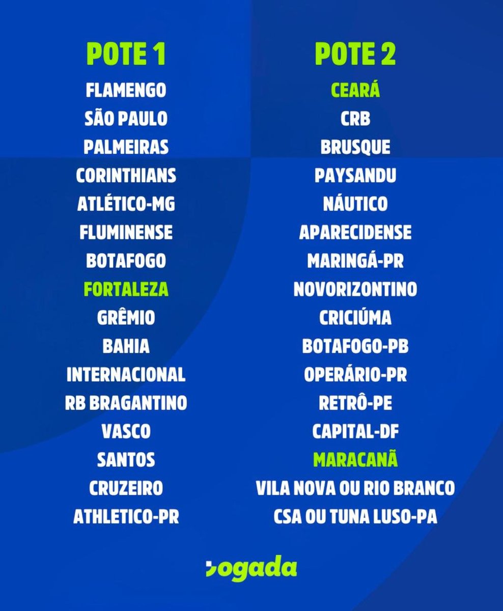 Confirmado os potes da Copa do Brasil. O único time da Série A que o Vasco pode enfrentar na próxima fase é o Ceará. Tem alguns da Série B