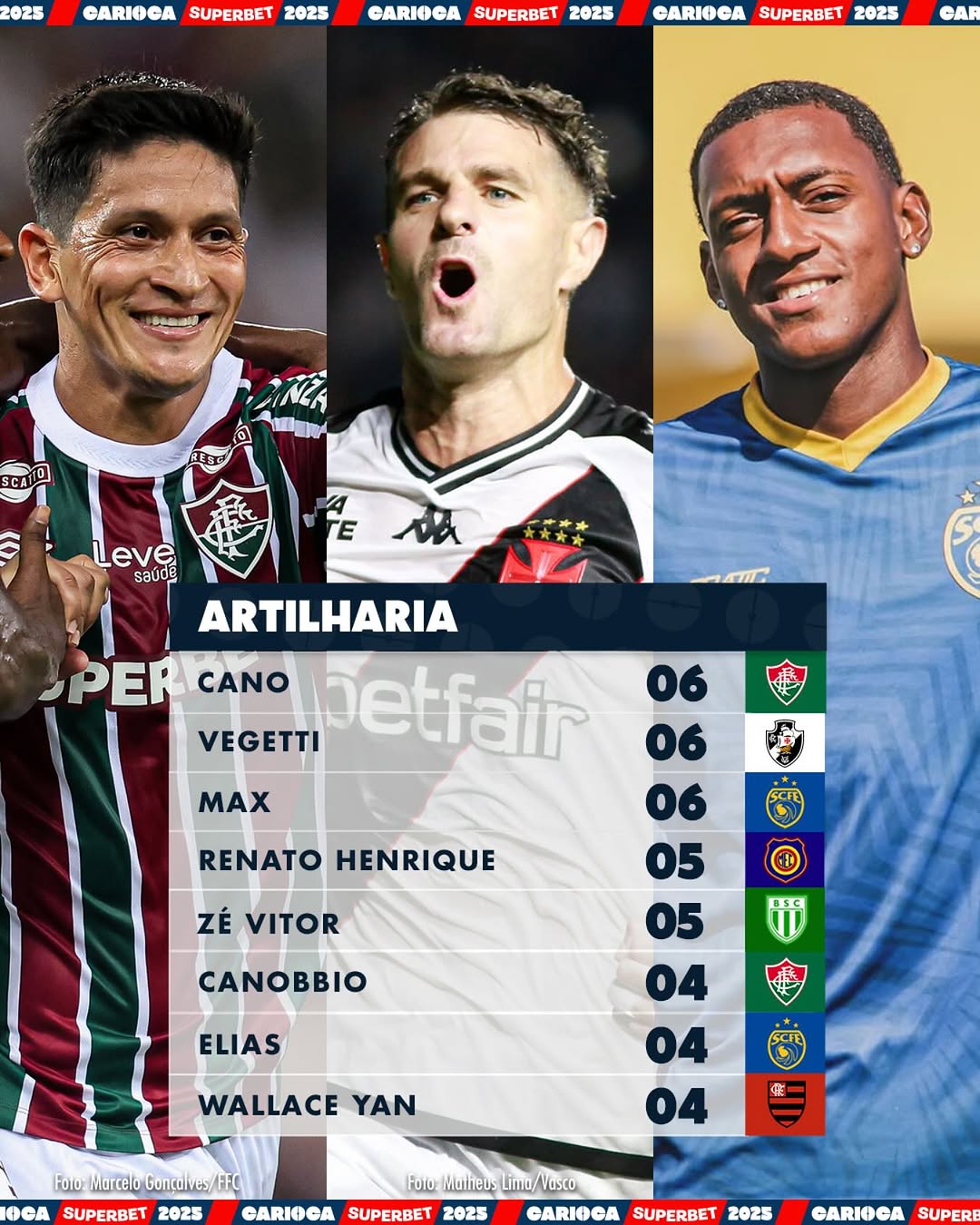3️⃣ atletas têm 06 gols cada e dividem a ponta da tabela dos que mais balançaram as redes no #CariocaSuperbet25!