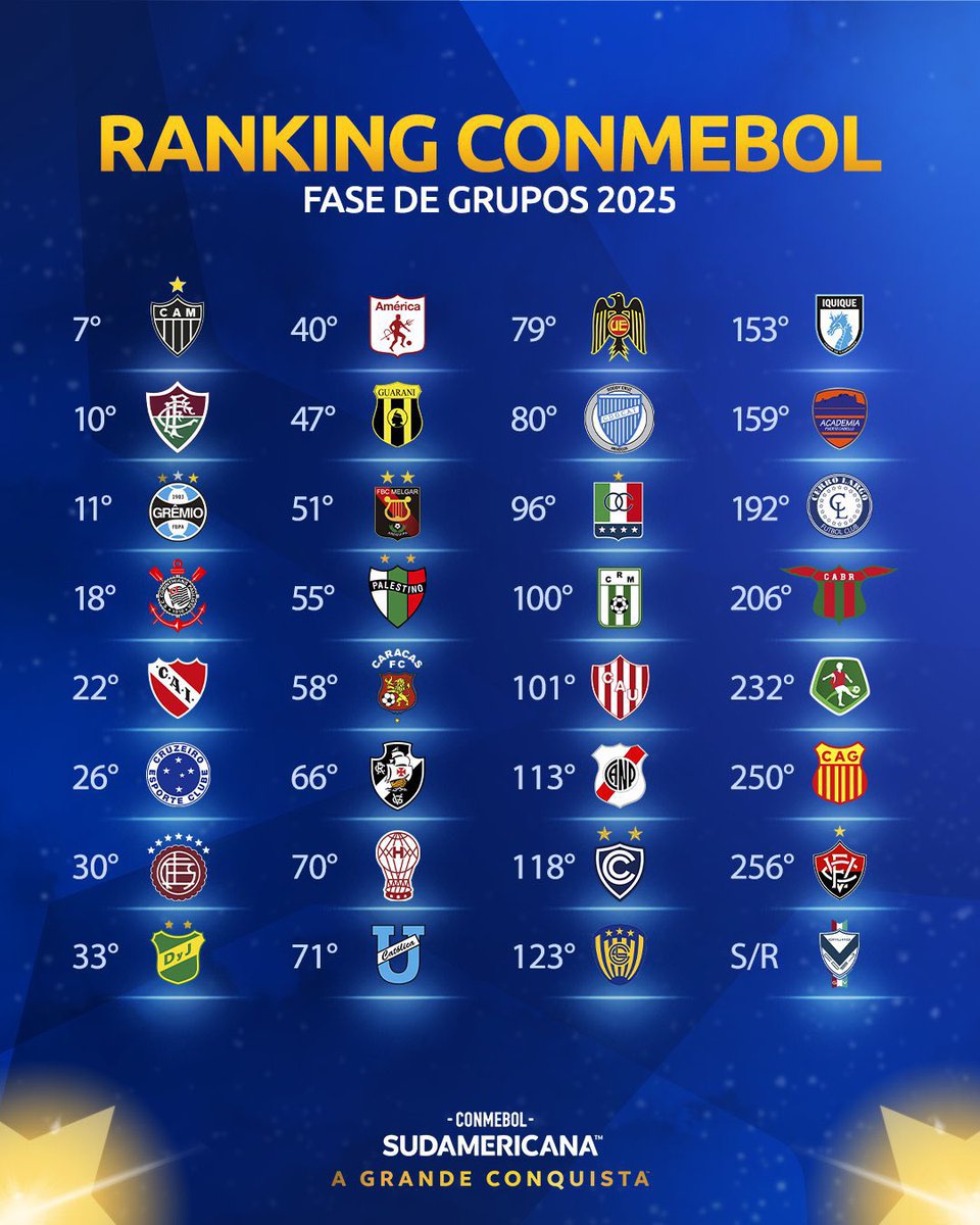 O ranking da Conmebol com os times presentes na fase de grupos na Sul Americana.