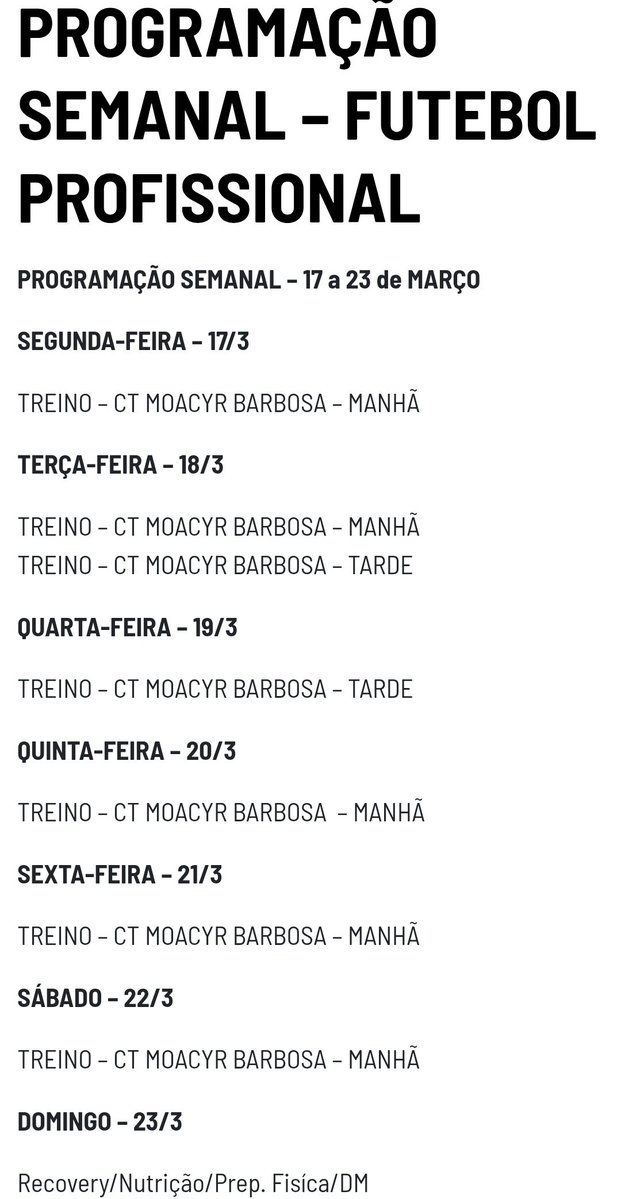 Elenco vai ao CT Moacyr Barbosa de segunda-feira a sábado, alternando treinos na parte da manhã e à tarde.