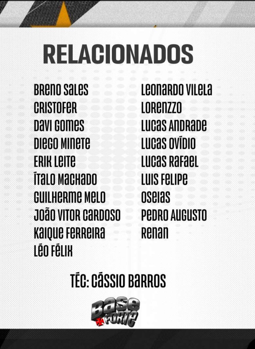 Esses são os jogadores relacionados para o jogo em que o Vasco enfrenta o Cuiabá às 16h, no CT Manoel Dresch. Essa é a partida de ida pelas oitavas de final da Copa do Brasil Sub-17.