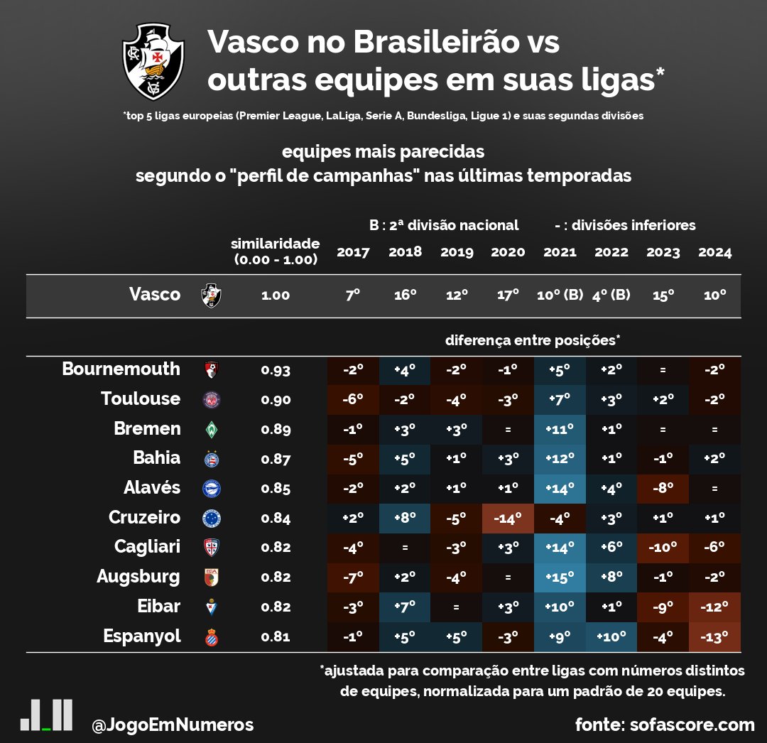 📊 Comparei as últimas campanhas do Vasco no Brasileirão com equipes do Brasil e das top 5 ligas europeias.