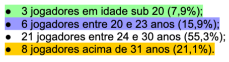 Outro aspecto que destoa de uma possível recuperação financeira são as poucas opções de jogadores jovens e formados na base no elenco principal, somente 3 (7,9%) de jogadores sub 20, onde o mercado oferece os maiores valores.