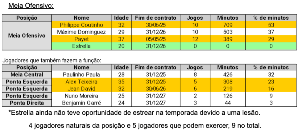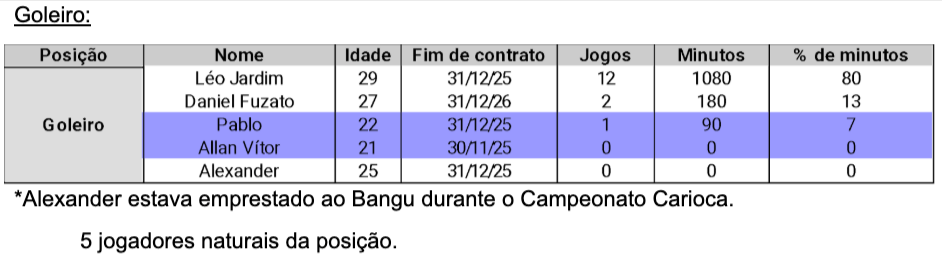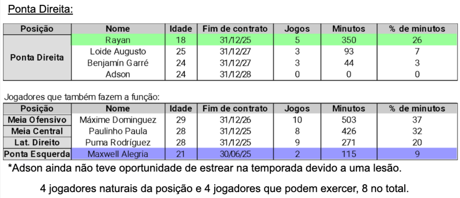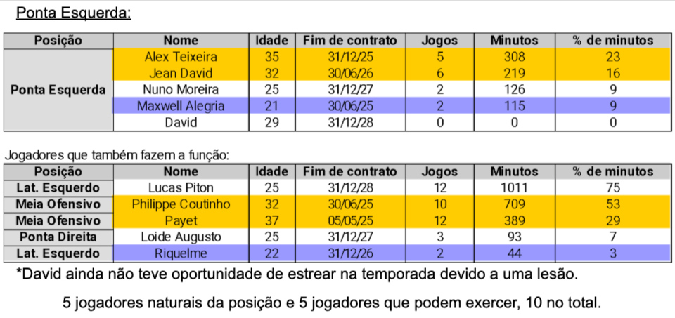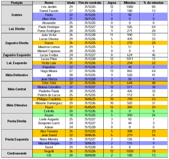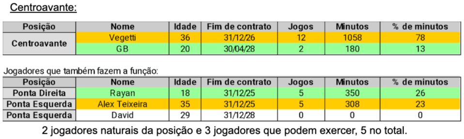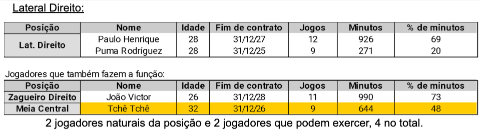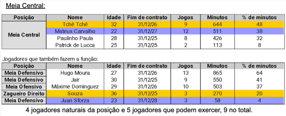 Analisando o tamanho do elenco fica claro que a quantidade de jogadores é excessiva nas posições de goleiros, zagueiro direito, meia central, meia ofensivo, ponta direita e ponta esquerda. E deveria ser reduzida a quantidade de atletas nessas funções, aliviando a folha salarial e facilitando o trabalho de preparação.