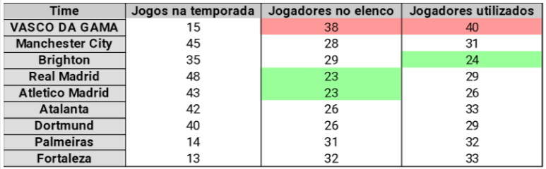 Times em momentos bem avançados na temporada possuem uso de quantidade significativamente menor de jogadores que o Vasco em início de temporada, ressalta-se ainda que haverá uma janela de transferência de meio de temporada pela frente, que gera um uso de novos jogadores que chegam. Mesmo comparando com times em início de temporada no Brasil como Palmeiras e Fortaleza, fica claro o tamanho do elenco excessivo.