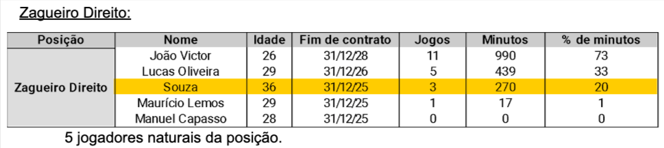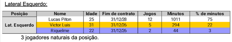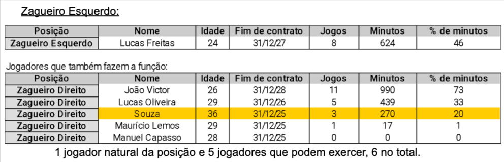 Já para a posição de zagueiro esquerdo temos apenas um jogador natural, necessitando de reforços.