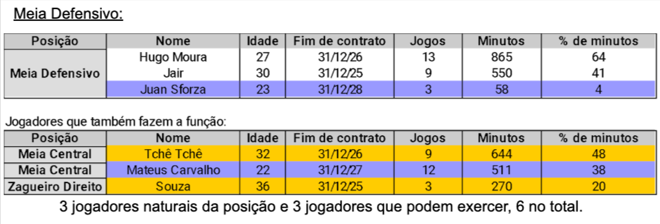E as posições de lateral direito, lateral esquerdo, meia defensivo e centroavante possuem uma quantidade adequada de jogadores.