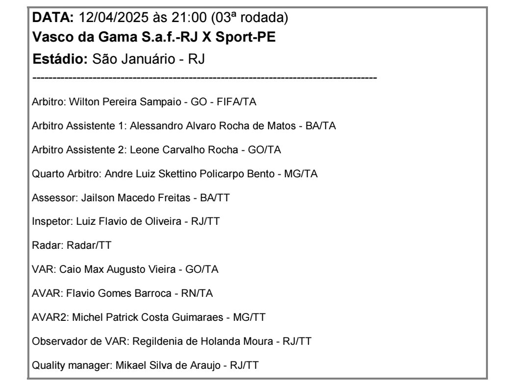 Confira a equipe de arbitragem que vai atuar no jogo entre Vasco e Sport, sábado, 21h, em São Januário. Wilton Pereira Sampaio (FIFA-GO) será o árbitro e no VAR estará Caio Max Vieira (GO).