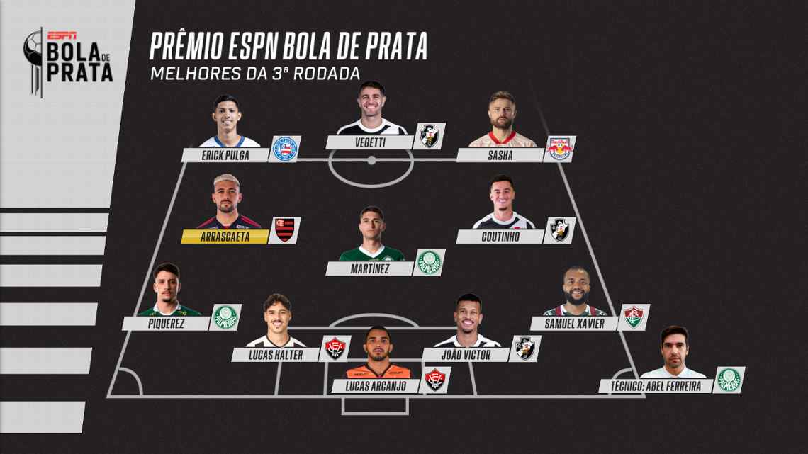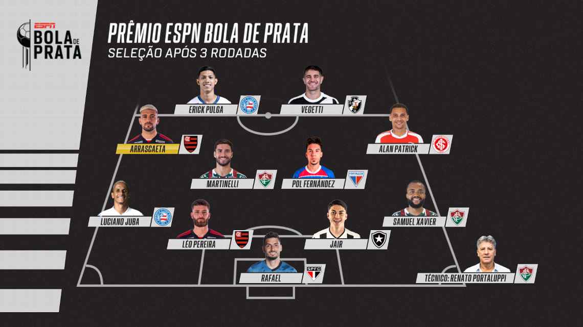 Após a 3ª rodada, a seleção do Bola de Prata ESPN é essa: Rafael (São Paulo), Samuel Xavier (Fluminense), Jair (Botafogo), Léo Pereira (Flamengo) e Luciano Juba (Bahia); Pol Fernández (Fortaleza), Martinelli (Fluminense), Alan Patrick (Internacional) e Arrascaeta (Flamengo); Vegetti (Vasco) e Erick Pulga (Bahia). Técnico: Renato Gaúcho (Fluminense).