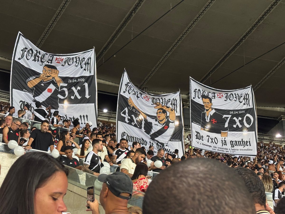 Torcida do Vasco levanta bandeiras em alusão a goleadas históricas contra o Flamengo.
